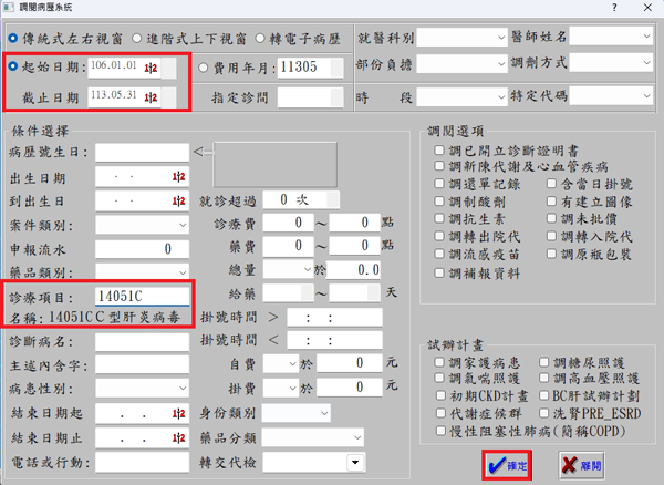 1. 於調閱病歷畫面,點選欲調閱的『起迄期間』或點選『費用年月』