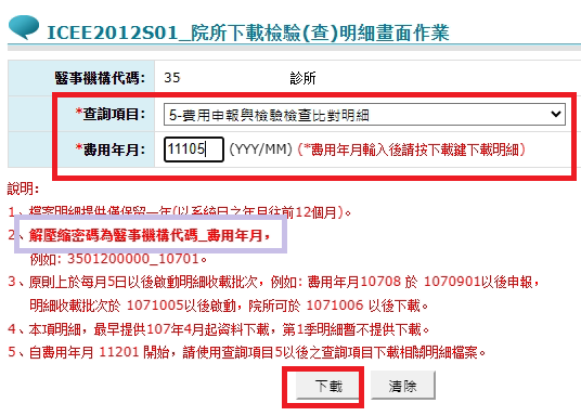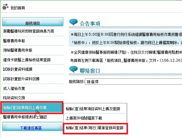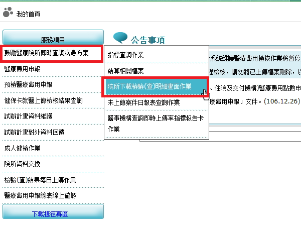 申報與檢驗(查)結果上傳案件比對明細,下載路徑:VPN健保資訊網服務系統/院所即時查詢病患方案/院所下載檢驗(查)明細畫面作業/5-費用申報與檢驗檢查比對明細。