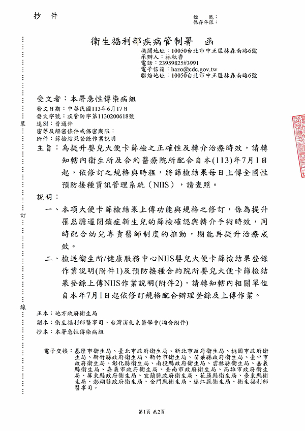 為提升嬰兒大便卡篩檢之正確性及轉介治療時效,自113年7月1日起,依修訂之規格與時程,將篩檢結果每日上傳NIIS
