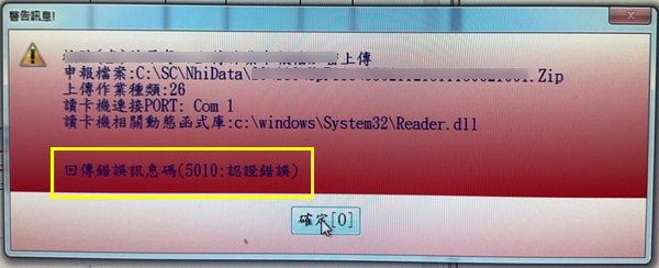 Q:若執行讀卡認證成功,於API程式上傳時仍出現『回傳錯誤訊息碼[5010:認證錯誤]之訊息』