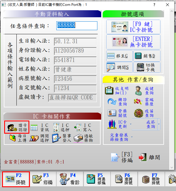 2. 於『2掛號作業』執行「F11 讀卡認證」或點選『F2 掛號』執行「讀卡認證」