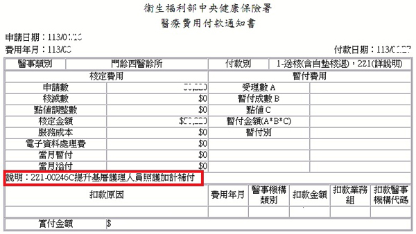 核發方式:本項獎勵費用由保險人每月依各診所門診診察費申報案件勾稽實際調薪情形,計算加計點數,以每點1元暫付,當月獎勵於申報門診診察費月份之次次月底前核發。