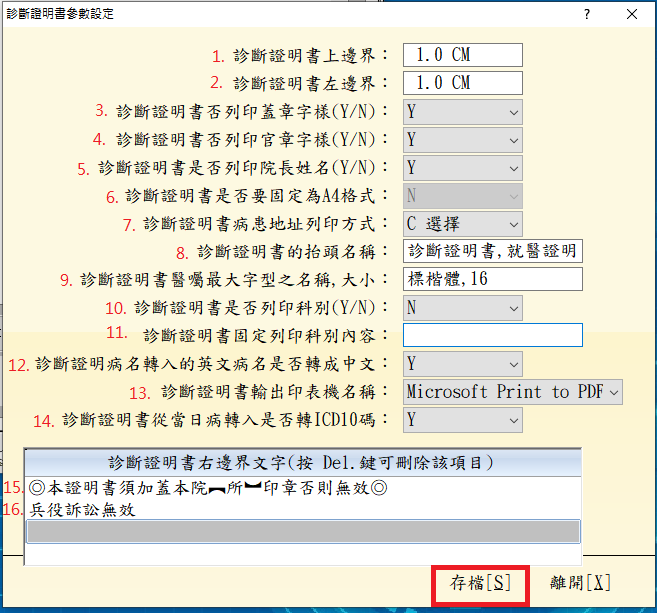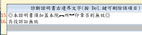 註4) 第15.16.項 診斷證明書右邊界文字可依院所需求自定修改,若不列印刪除該行即可