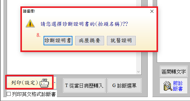 註1) 第8項 診斷證明書的抬頭名稱可自定三組,列印時會出現選單,如下圖示