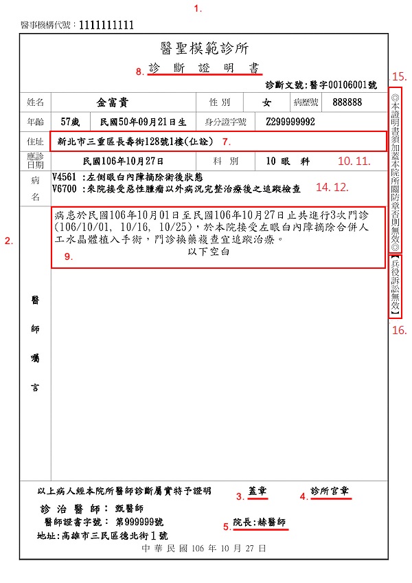 如下圖示,參數設定完成的顯示範例結果如下圖公版診斷證明書依數字編號對應位置