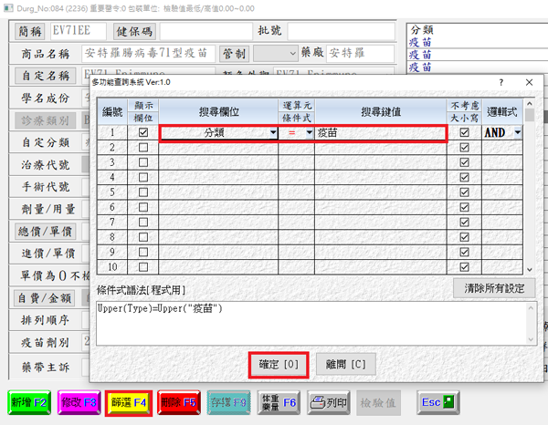 於「搜尋欄位」點選「分類」、「修件式=」、「搜尋鍵值」輸入「疫苗」,再按下「確定」