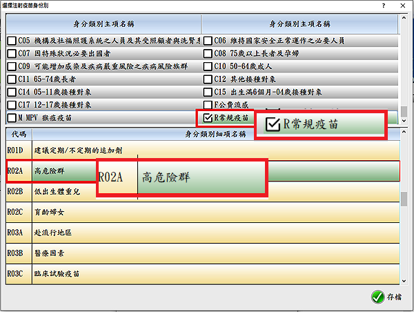*疫苗身分類別代碼表點選(R常規疫苗)>再點選R02A*