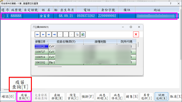 點選右下角紅框處,即可查詢看診個案由疾管署提供預防接種記錄,如下圖示