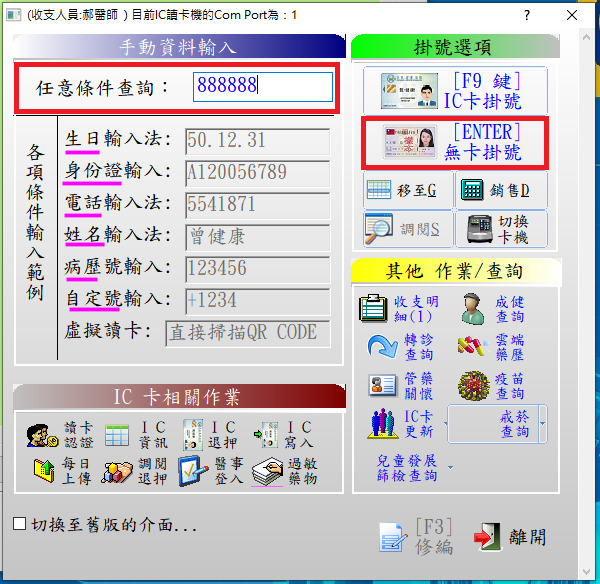 操作説明:於任意條件查詢欄位輸入欲查詢個案基本資料,再點選『無卡掛號』