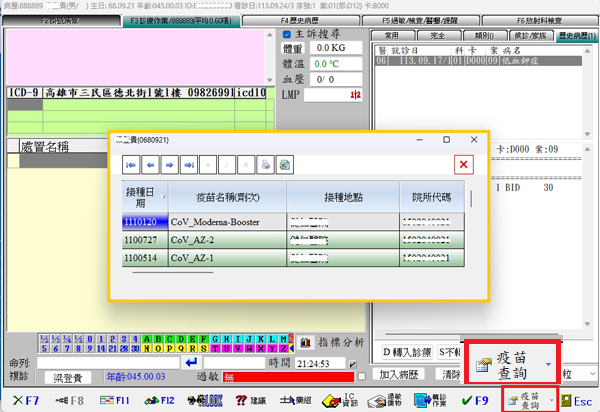 4. 設定完成後,於『F3診療作業』畫面下方的診療多功能按鈕鍵預設已變更為疫苗查詢功能