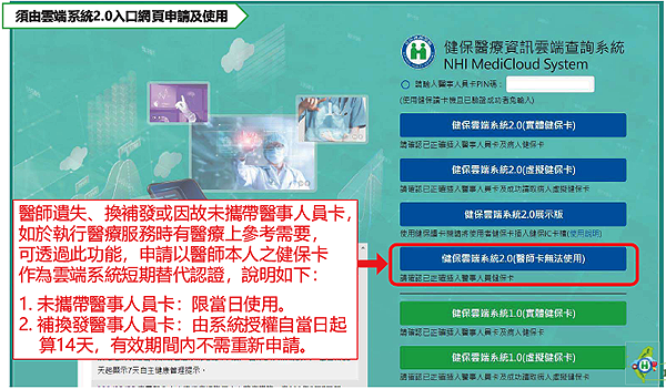 為醫師診療及病人就醫安全所需,自113年10月25日起本署健保醫療資訊雲端查詢系統2.0新增「醫師於醫事人員卡無法使用期間可申請運用醫師健保卡進行短期替代認證」之機制!