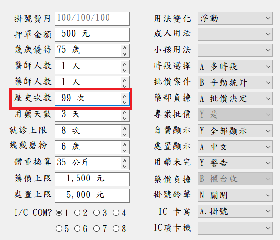 方式1) 預設回推看診次數,於『B院所資料』左側區「歷史次數」設定