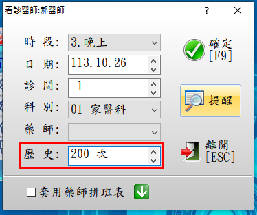 於進入『3診療作業』時修改欲顯示「歷史」病歷回推次數,退出看診時即恢復預設次數