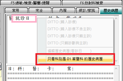 若有二科以上看診可使用『只看科別是XXX科的歷史病歷』功能,於就診日欄按滑鼠右鍵即可顯示,如下圖示。點選後(勾選)歷史病歷畫面只會顯示該科資料,(取消勾選)歷史病歷畫面則會顯示正常次數。
