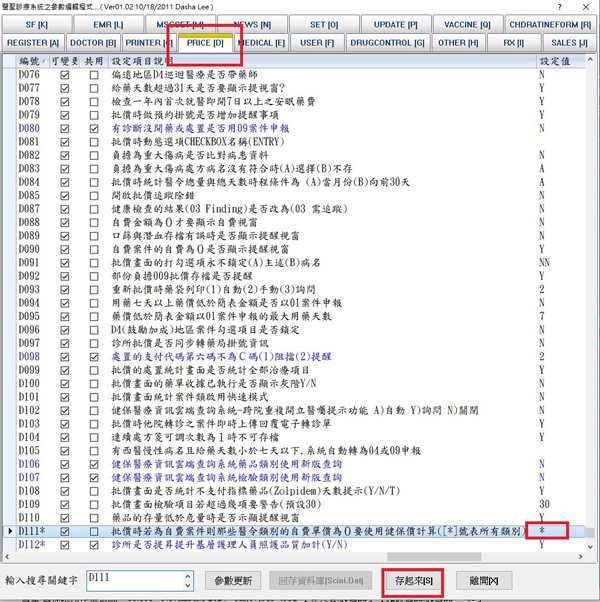 D111 批價時若為自費案件則那些醫令類別的自費單價為0要使用健保價計算 右方設定值輸入*