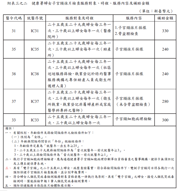 1. 擴大服務對象及時程:醫令代碼31、35、38、37及33新增25至29歲婦女每3年1次。