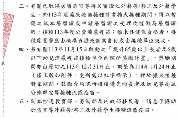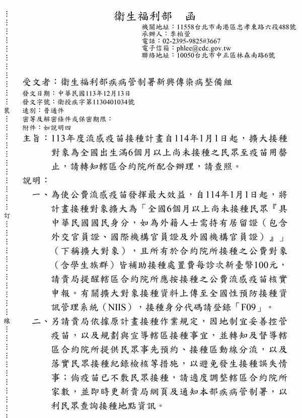 113年度流感疫苗接種計畫自114年1月1日起擴大接種對象