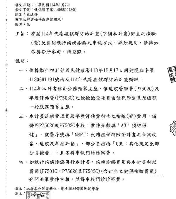 轉知有關114年代謝症候群防治計畫衍生之檢驗(查)及併同執行疾病診療之申報方式