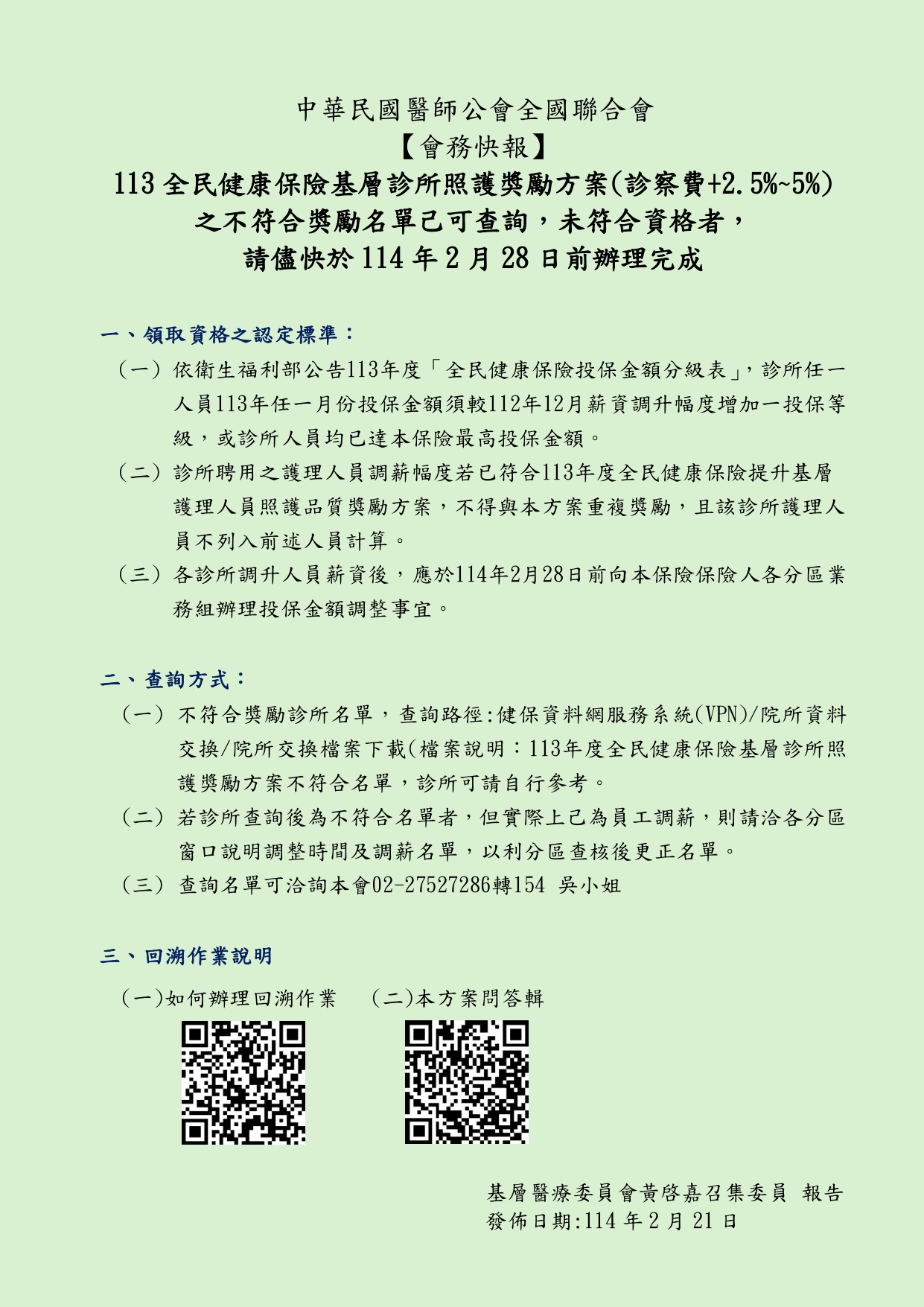 【會務快報】113全民健康保險基層診所照護獎勵方案(診察費+2.5%~5%) 之不符合獎勵名單已可查詢,未符合資格者,請儘快於114年2月28日前辦理完成