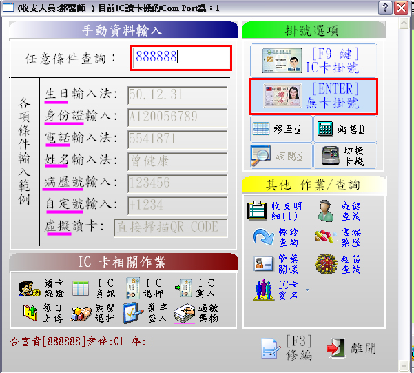 1. 於『任意條件查詢』欄位輸入欲掛號對象資料,可使用粉線處條件調閱,再點選『無卡掛號』