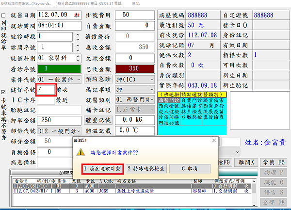 於掛號新增視窗『健保序號』欄內輸入『 / 』,會出現如下圖選擇視窗