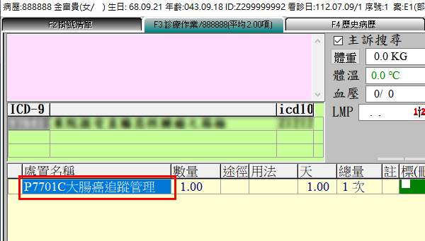 於『F3診療作業』畫面,處置內容輸入本計畫申報醫令代碼,例如『P7701C』