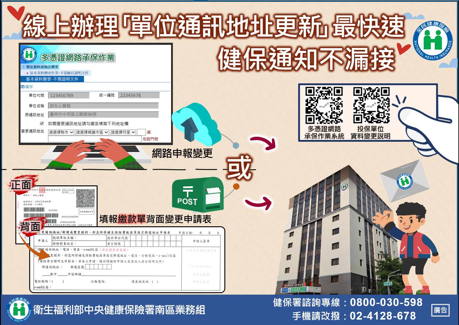 林組長提醒,目前多數投保單位均已註冊健保署「多憑證網路承保作業系統」,可直接登入該系統,點選「單位資料查詢及變更/基本資料變更作業」功能,隨時隨地動動手指就能完成,相當便捷。另外,如仍需使用紙本申請,亦可以利用繳款單背面的「變更申請表」,將通訊資料填妥正確並加蓋大小章後,郵寄辦理。