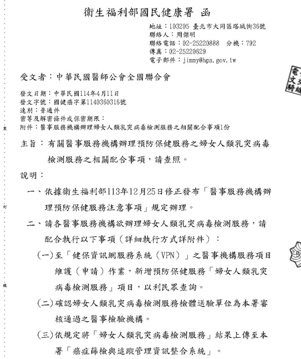 辦理預防保健服務之婦女人類乳突病毒檢測服務之相關配合事項