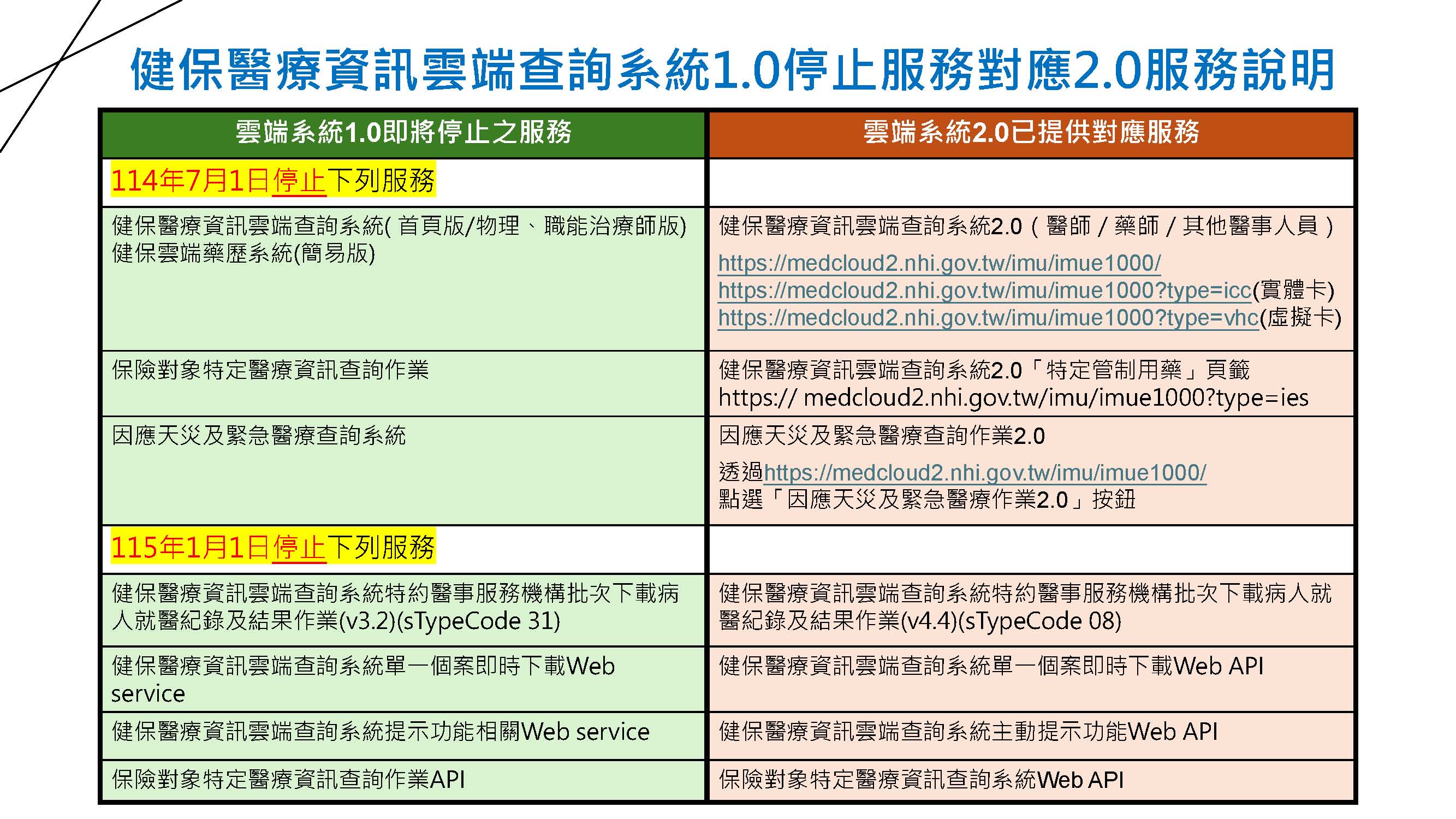 「健保醫療資訊雲端查詢系統1.0」(網頁版)自 114年7月1日0時起停止服務,相關公告及對應2.0服務說明詳如附件