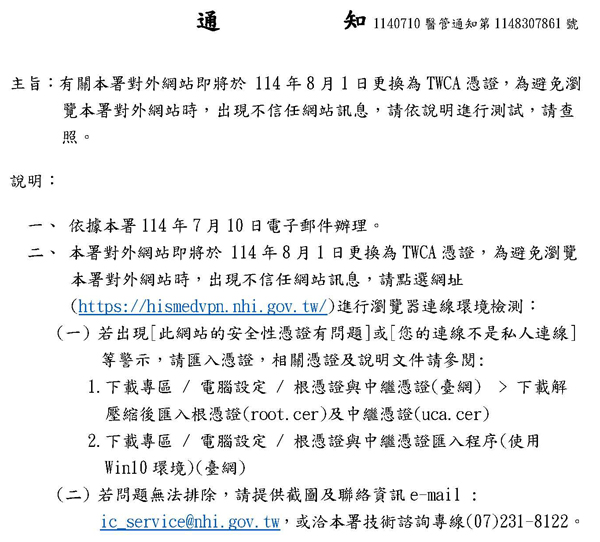 本署對外網站即將於114年8月1日更換為TWCA憑證