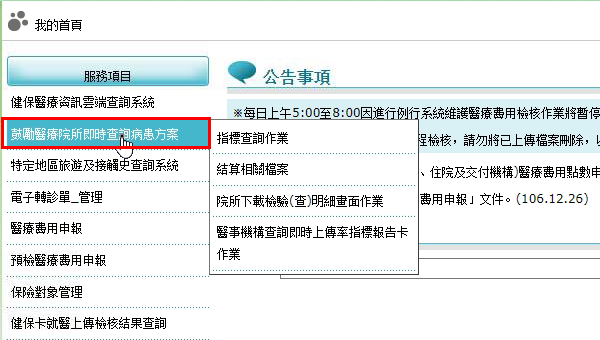 步驟二、登入成功後,請點選「服務項目:鼓勵醫療院所即時查詢病患方案」之各項服務功能