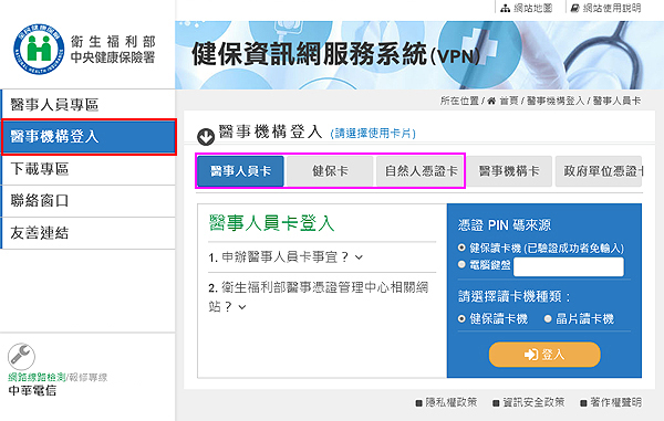 步驟一、開啟健保資訊網服務系統(VPN):使用具權限者之憑證卡登入