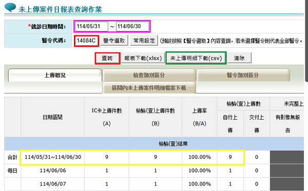 下方區會出現符合查詢結果,若有需要下載檔案,請再點選『未上傳明細下載(csv)』