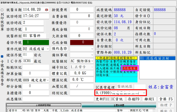 *於右側快速選單點選「流感疫苗」(D2案件)、於「IC異常處理」點選代碼『F000』『存檔』即可