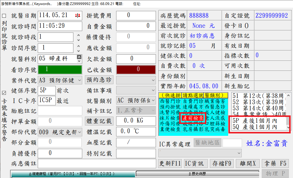 掛號操作同產前檢查方式->執行IC卡掛號,點選快速選單,再按下存檔即可。