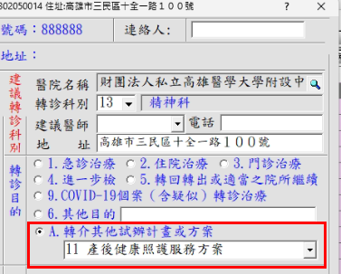 系統內建電子轉診作業API上傳系統「轉診目的」內的「轉診目的(轉介其他試辦計畫或方案)」