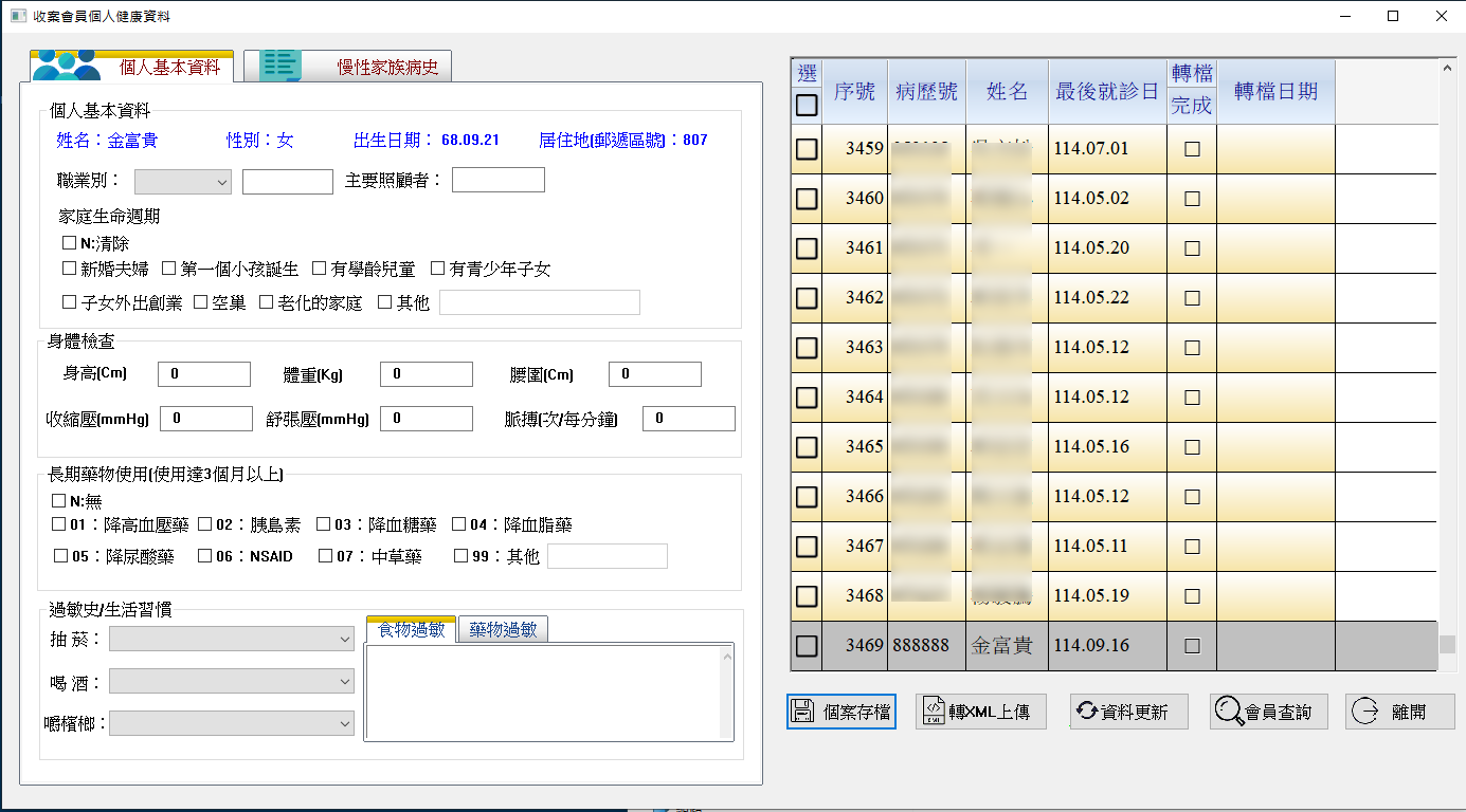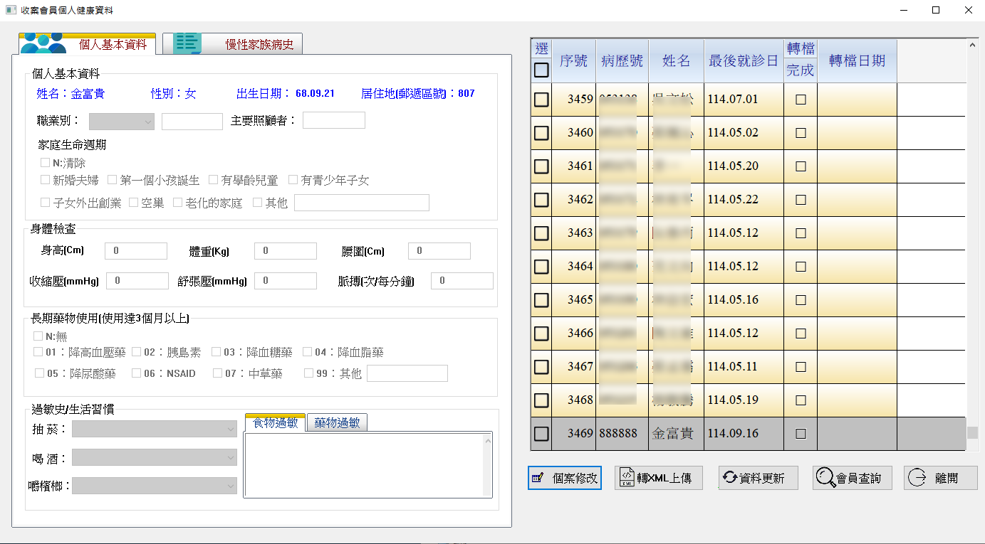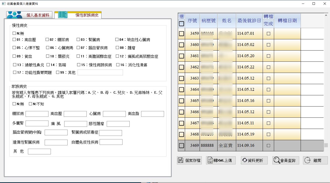 2. 點選「個案修改」於視窗左側個人基本資料及慢性家族病史資料頁籤進行編輯,如下圖示