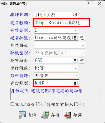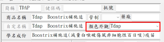 ●於藥品資料內『顏色外觀』欄位(疫苗代碼)設定『Tdap』(大小寫須一致)