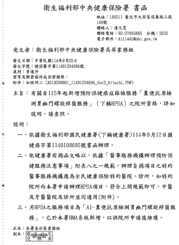 有關新增預防保健癌症篩檢服務「糞便抗原檢測胃幽門螺旋桿菌服務(HPSA)」院所資格申請說明