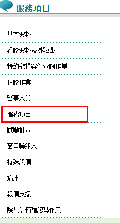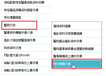 服務項目:點選「醫務行政」再點選「特約機構作業」