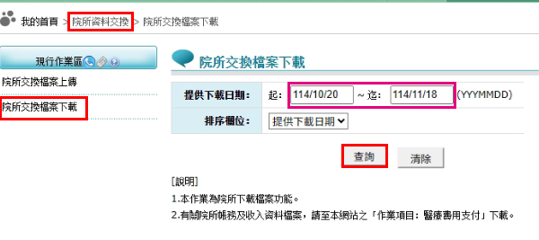 於「提供下載日期」輸入起「1141020」~迄「1141118」再按「查詢」