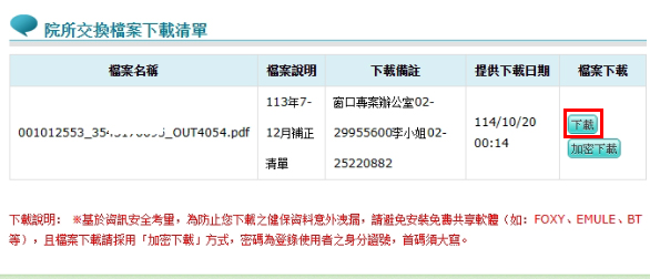 主指:有關貴院(所)113年7至12月預防保健服務檢查結果資料上傳筆數不完整一案,未上傳檢查結果之預防保健服務項目及清單請於系統下載,並參照補正上傳說明如附件,於114年11月18日前補正上傳資料,如逾期仍未補正,本署將請健保署追扣申報費用,請查照。