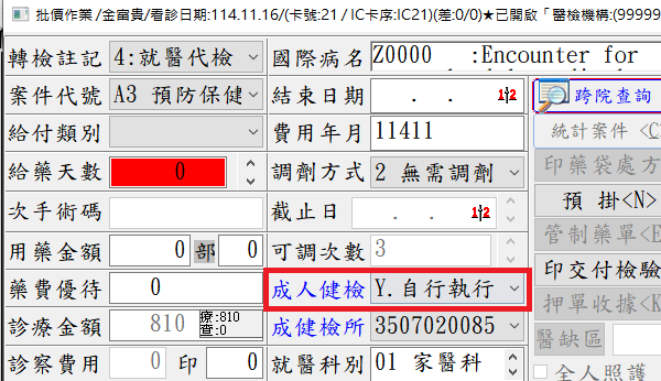 診療作業畫面: *更版後新增掛入資料醫令時程代碼會自動帶入*歷史病歷需手動調整更新IC上傳!