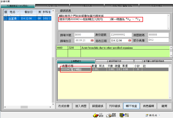 檢查提示:轉診(轉出)醫令01036C=>相對轉出入院代()第一碼應為...
