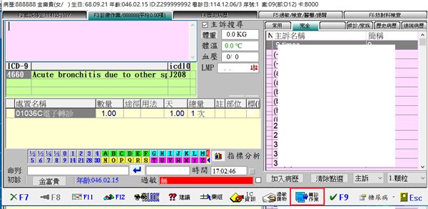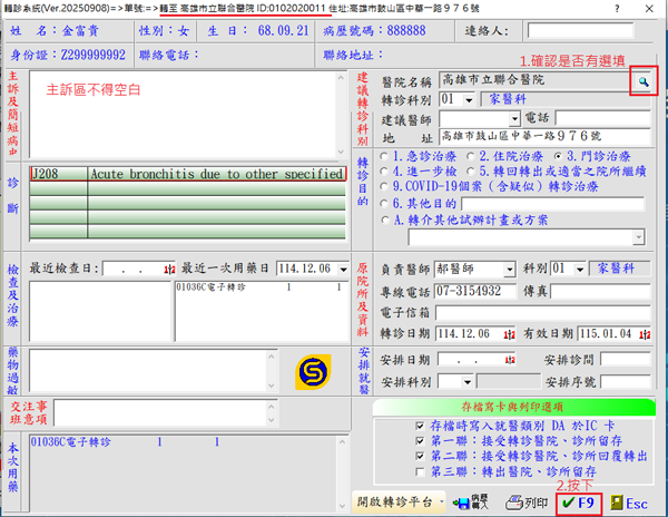 2. 於『轉診系統』畫面,確認「醫院名稱」是否正確,確認無誤再按下「vF9」回至看診畫面