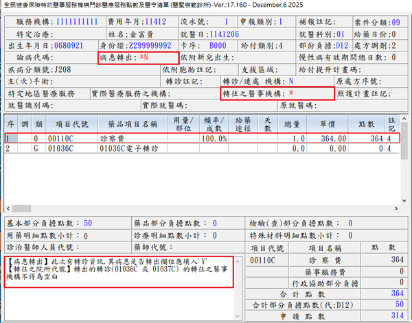 檢查提示:病患轉出:* / 轉往之醫事機構:* 表示有轉診醫令但無正確對應資料