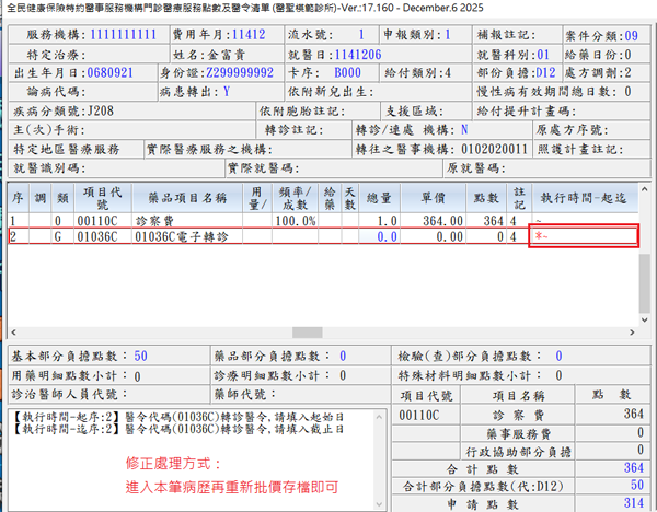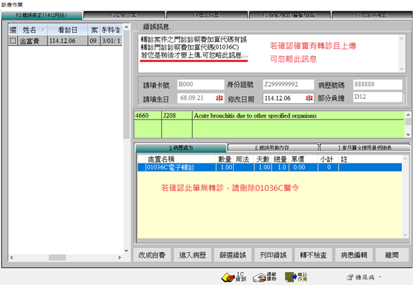 2. 確認此筆病歷無轉診,刪除01036C醫令,再重新批價存檔即可。