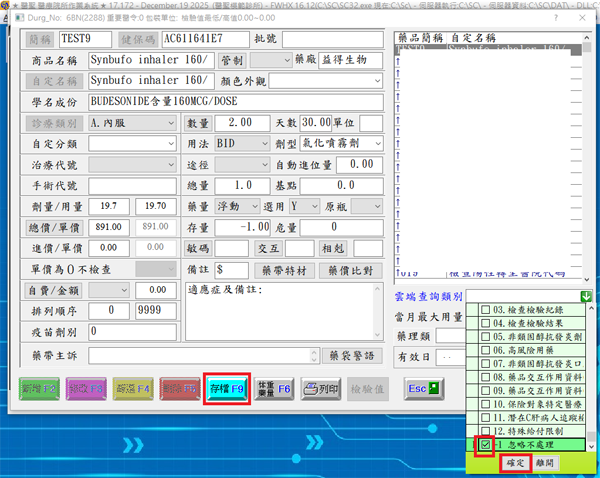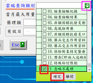 再將非適用之醫令,進入藥品資料內勾選「-1 忽略不處理」即可!(下次即不會再送出查詢)