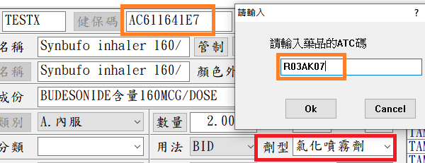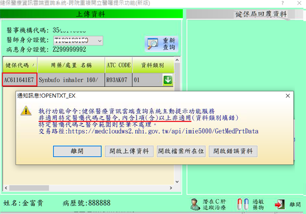 若送出查詢資料出現*非公告適用之ATC 碼/醫令代碼*時,則無法查詢成功,如下圖示