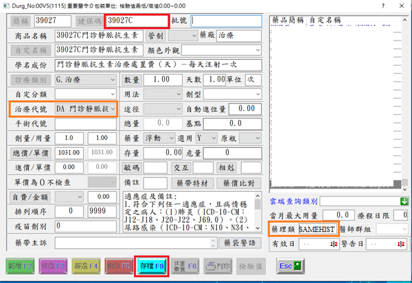 (1)『簡稱』輸入自定名稱,於『健保碼』輸入「39027C-39030C」後按下『Enter』鍵即可帶出預設資料